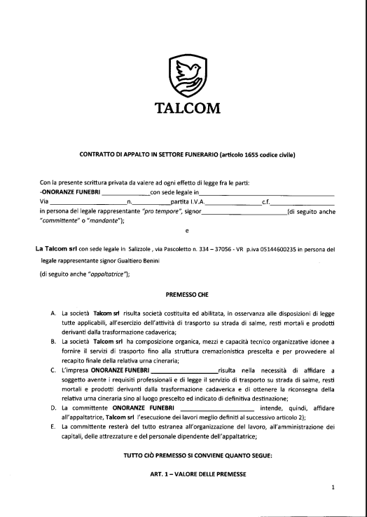 Il presente documento disciplina le condizioni contrattuali applicate ai servizi forniti da TALCOM SRL nel settore funerario.